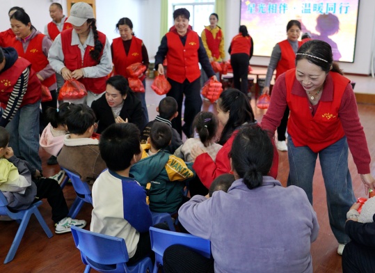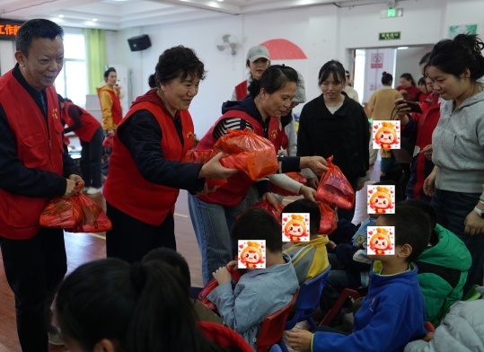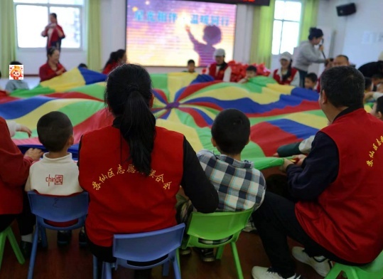志愿者们身着红马甲,带领孩子们手拉手做游戏、敲非洲鼓,用彩虹伞“编织”欢乐,用礼物传递温暖。鼓点清脆,笑声飞扬,每一份陪伴都化作星光,照亮孩子们的成长路,让爱与温暖在春日里肆意流淌。